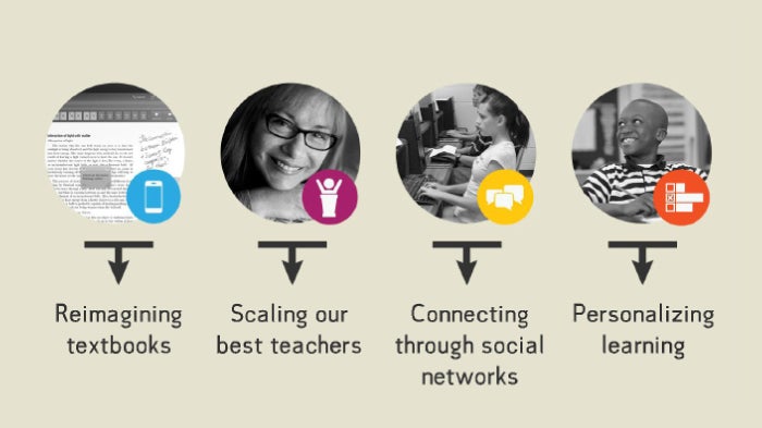 There really is no limit to what teachers can do if they have the right resources. A decade from now, finding and using the best content and technology will be as natural as opening a book. Tablets and high-speed Internet access will be ubiquitous. Each student will have a learning map that helps chart their interests and learning path inside and outside the classroom. And the concept of the textbook will fade—replaced by easy online access to the best lectures and course materials available.